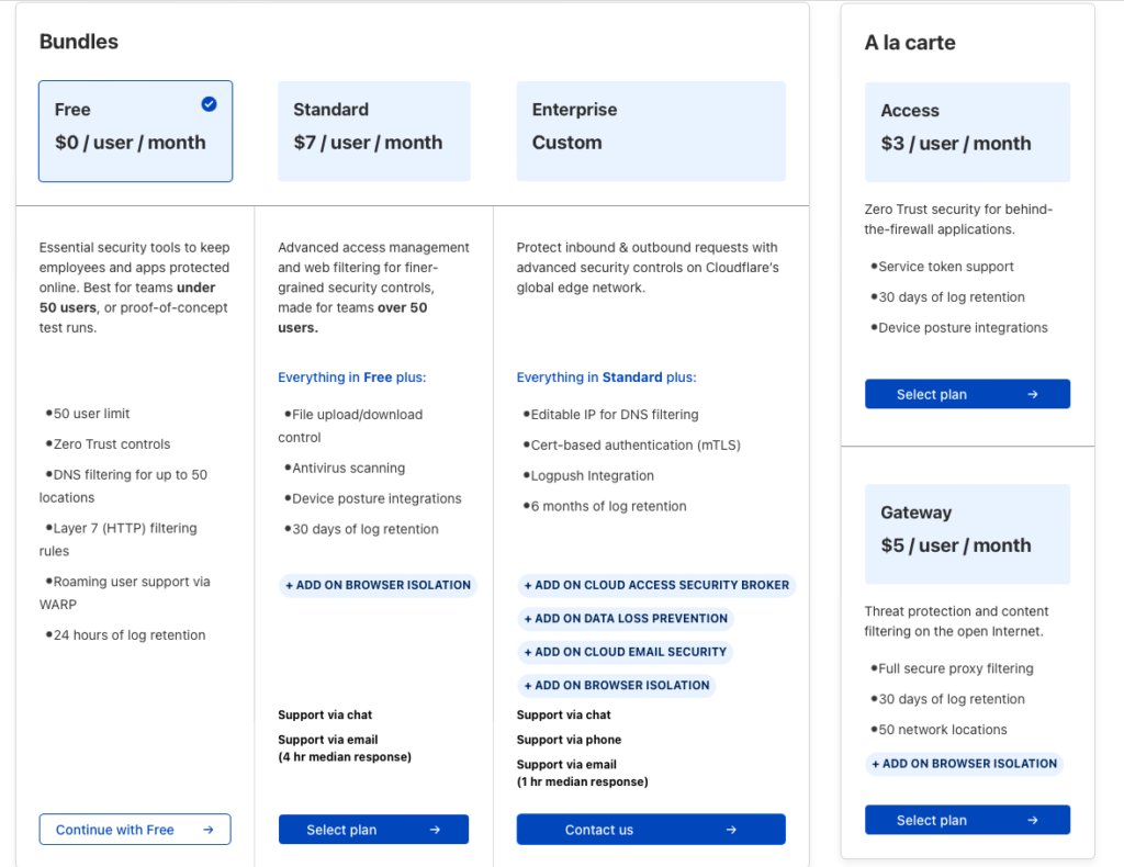在进入到Zero Trust板块后,平台会要求输入团队信息、选择的套餐,在这里我们选择Free Plan免费版即可(如果有高需求可以按页面套餐购买)。