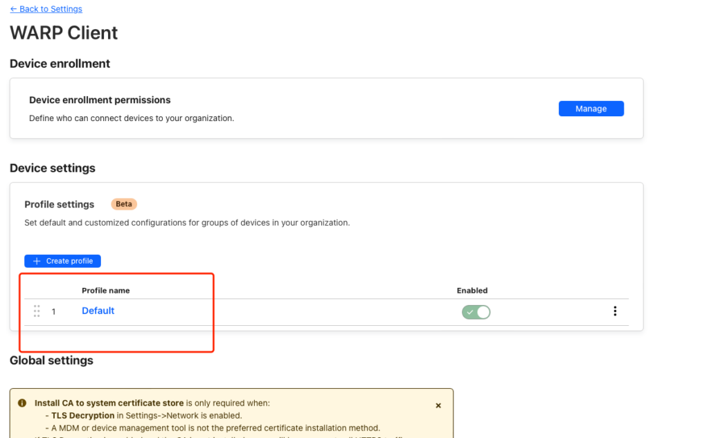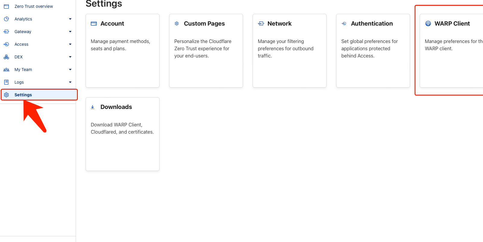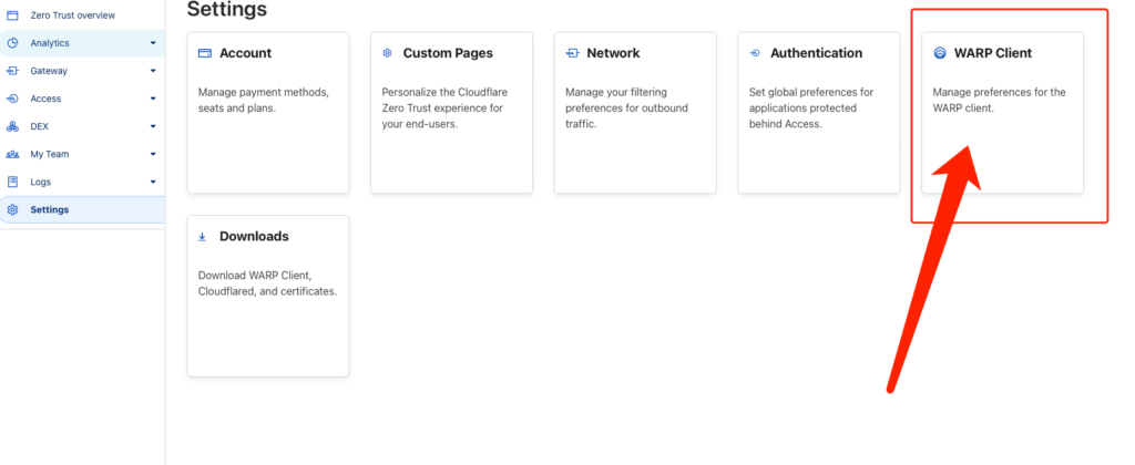 但目前我们还无法正常通过客户端去连接到我们的Zero Trust网域,在这里我们访问Settings中的Warp Client板块进行配置。