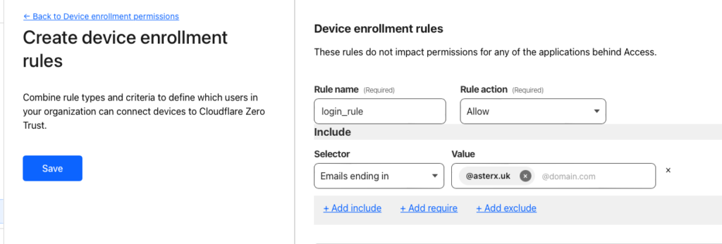 举例说明:我在图片中所创建的规则就是所有邮箱地址结尾为asterx.uk的用户均可访问此Zero Trust网域,比如abc@asterx.uk这个邮箱就可以访问