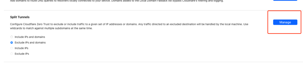 在这里你就可以配置Zero Trust网域的分流规则,Exclude模式就是不会代理列表中的IP或域名,可以自行配置。