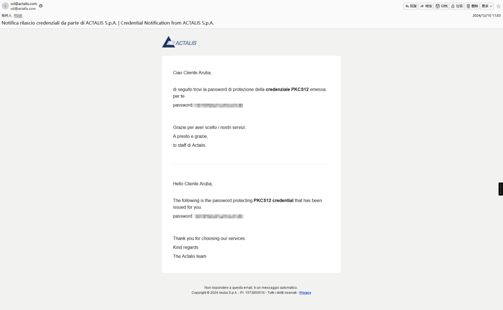 在申请后 Actalis 会向你的邮箱发送一个验证邮件,点击验证后等20分钟左右会把证书的密钥通过邮件的形式发送到邮箱里。