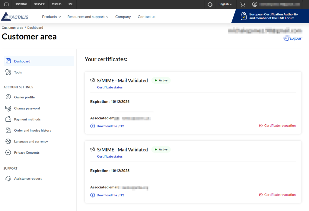 再等上一个小时左右,就可以在 Actalis 网站的用户首页下载证书了。