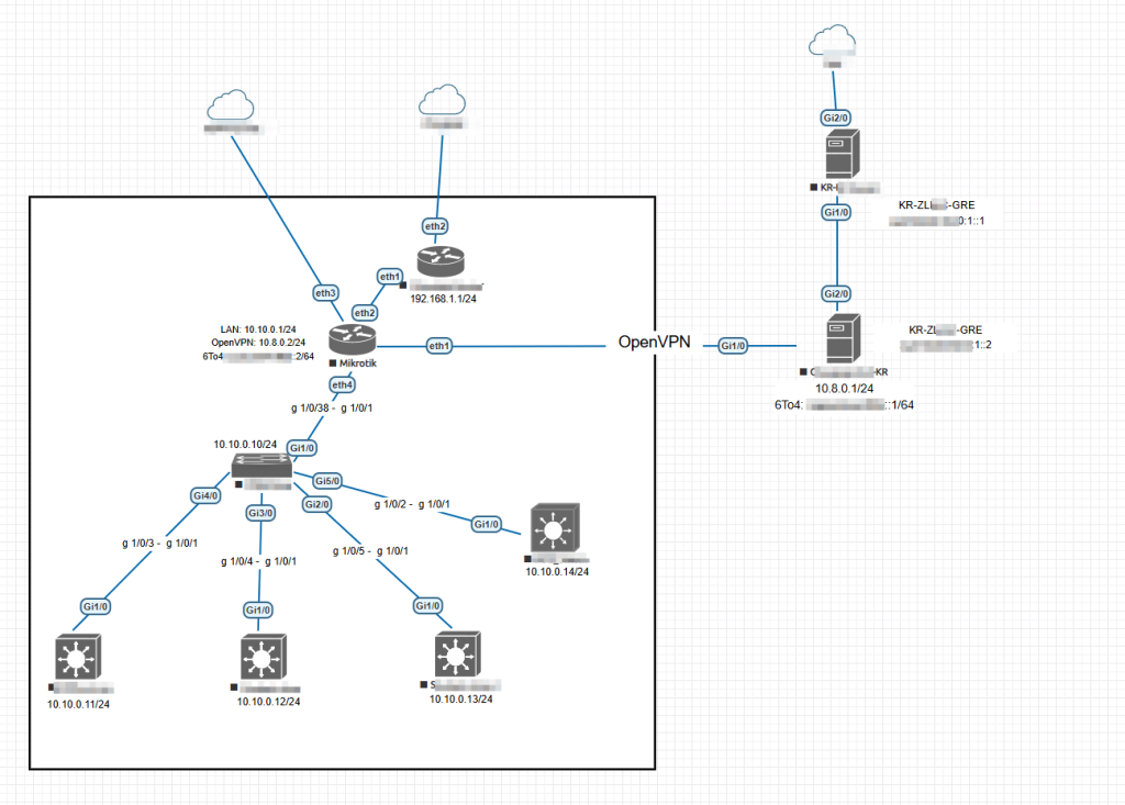 | Mikrotik路由器 | 10.10.0.1/24 10.8.0.2/24 (OpenVPN) 2a0a:xxxx:xxxx:xxxx::2/64 (6To4 Tunnel Over OpenVPN) |