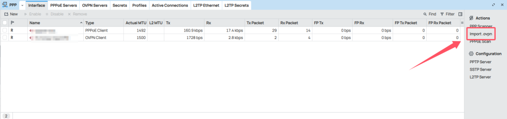 打开Mikrotik的PPP配置部分可以在这里导入OVPN配置,不再作过多赘述。在导入连接并成功连接后,可以点开对应的连接查看到本端被分配到的IP,由此可以看到我们被分配到的IP是10.8.0.2。