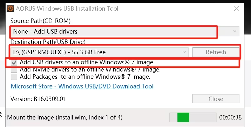 Source Path 那里不用动,Destination Path 选择你的 Windows 7 启动 U 盘,然后如果是用 U 盘安装,就把第一个选项勾上就够了,如果你想把系统安装到 NVMe 硬盘上,同时还要选第二个选项,然后点击开始即可。